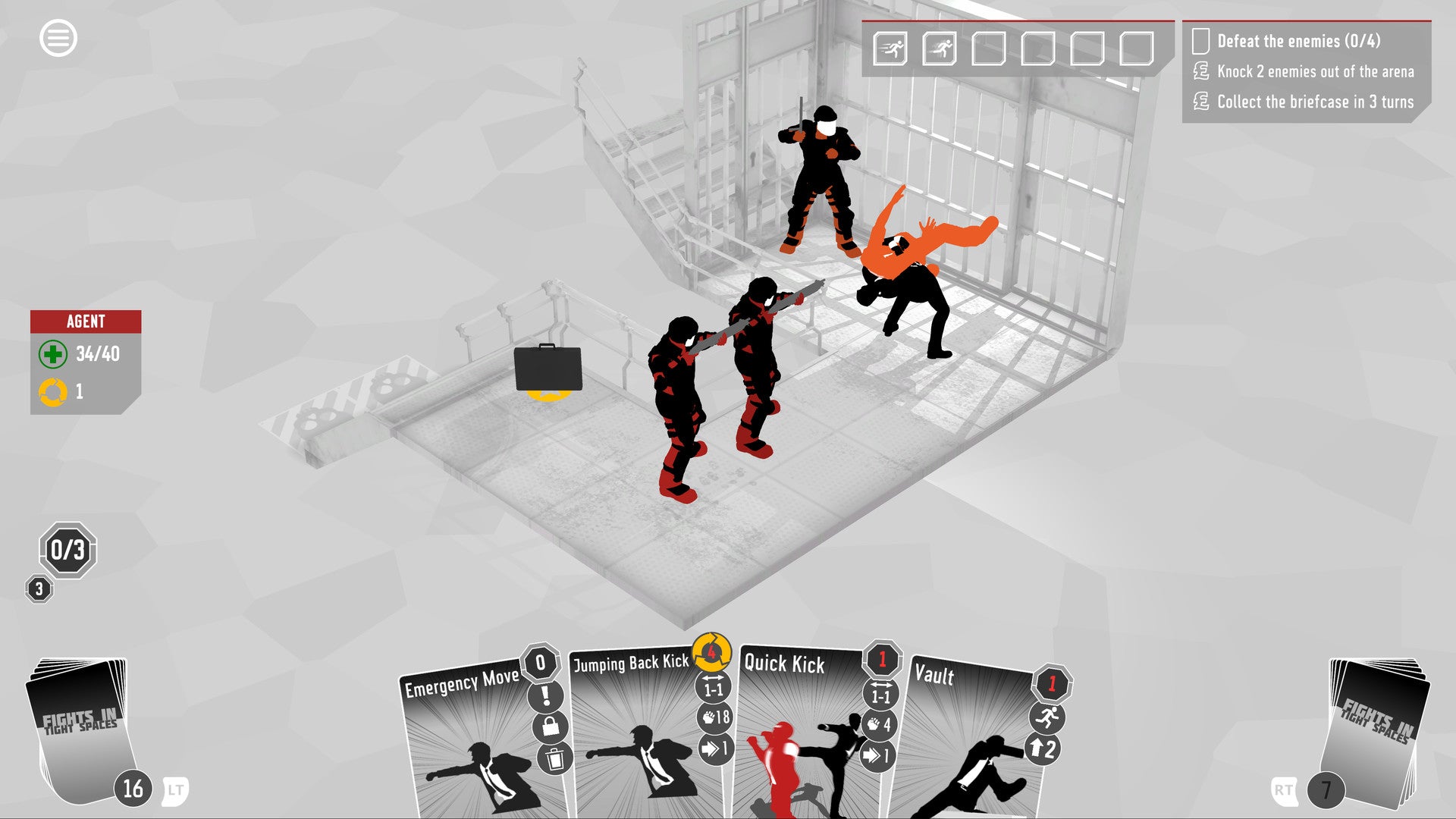 Fights in Tight Spaces este un joc de acțiune captivant, pe ture, care combină lupta tactică cu jocuri de acțiune rapide și pline de acțiune. În acest joc, jucătorul preia rolul unui agent secret însărcinat cu lupta împotriva agenților inamici în spații înguste și restrânse. Jocul este construit în jurul unei mecanici de tip „bullet time” care permite jucătorului să încetinească timpul și să își planifice atacurile cu precizie. Această mecanică este deosebit de importantă în spațiile înguste, unde mișcarea este limitată, iar atacurile trebuie să vină rapid și precis.