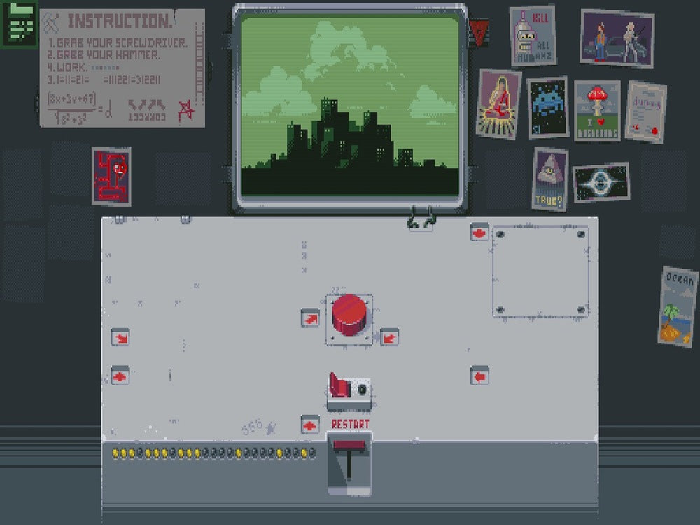 Jocul se desfășoară pe un singur ecran cu un singur buton roșu. Sarcina jucătorului este să evite apăsarea acestui buton, dar nu este atât de ușor pe cât pare. Există, de asemenea, o serie de alte butoane și comutatoare pe ecran pe care jucătorul le poate apăsa sau comuta pentru a afla ce se întâmplă. Aceste apăsări de butoane au adesea consecințe neașteptate care afectează lumea jocului și comportamentul personajelor. Sarcina jucătorului nu este doar să evite apăsarea butonului roșu, ci și să înțeleagă sistemul complex al jocului care răspunde la apăsările butoanelor și interacțiunile jucătorului.